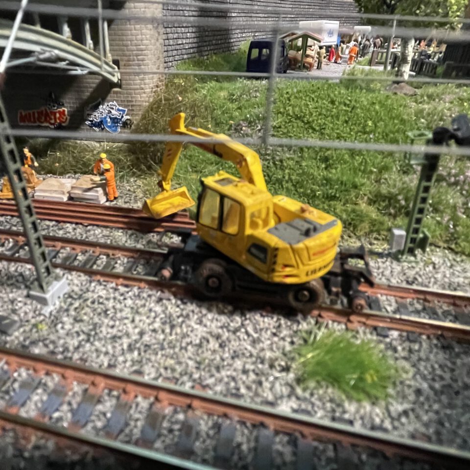 Track work is rewarding scenes to recreate on the model railroad. It makes it possible to bring the mini figures and vehicles close to the track. They reflect the dynamics of the rail business. A train moving slowly past the works. A workman holding a flag high. The work mostly involves cranes on trolleys. Excavators or cranes that can operate on both road and rail. Krol in brief.