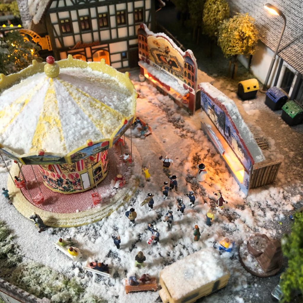 Omdat de sneeuw onbelemmerd overal op valt, moeten de Preiserlein figuurtjes met een penseeltje ontdaan worden van de – in verhouding – immense hoop sneeuw op hun hoofdjes.